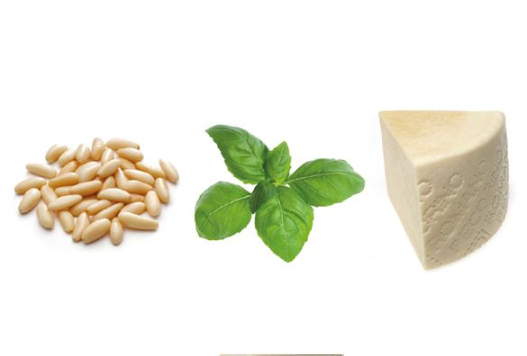 Basil 30.4%, sunflower oil, extra virgin olive oil 23.7%, Parmigiano Reggiano DOP ( milk , salt, rennet), Pecorino Romano DOP ( sheep ’s milk, salt, lamb rennet) 3.6% , salt, pine nuts 1%, garlic, antioxidant: ascorbic acid, acidity regulator: citric acid.